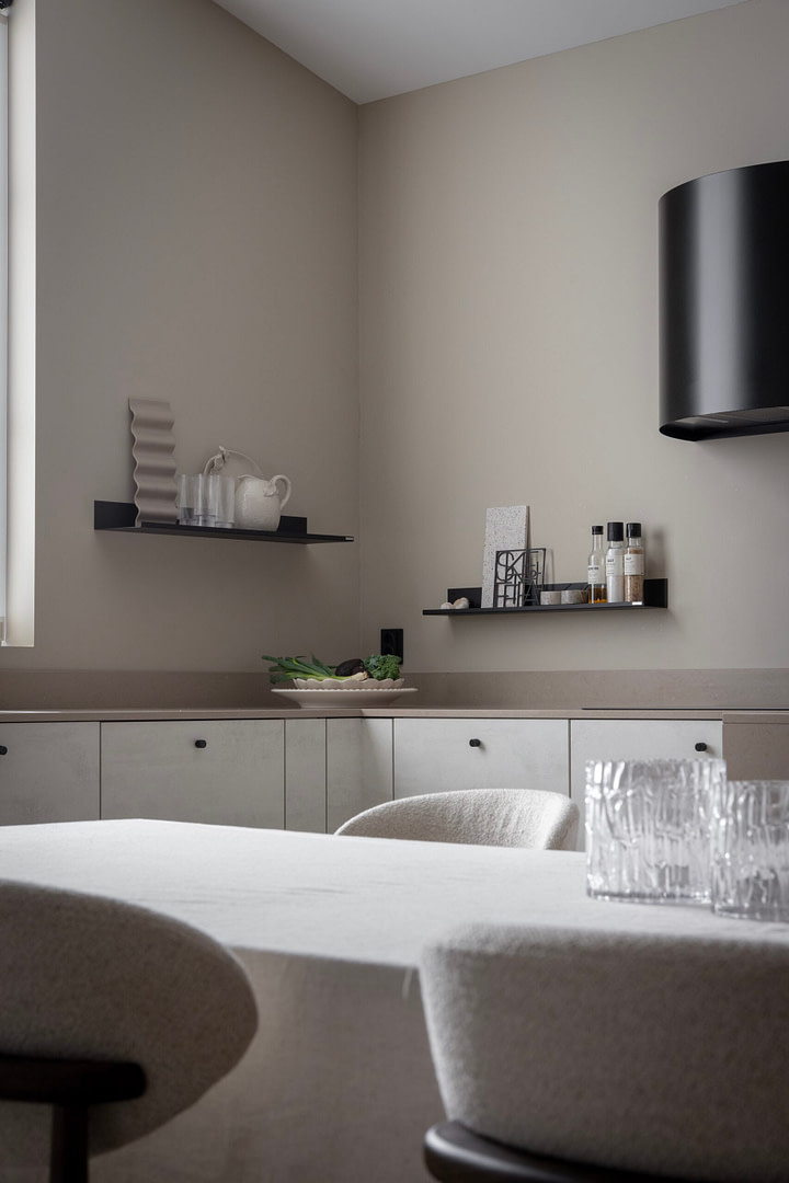 Ljust kök med öppen förvaring